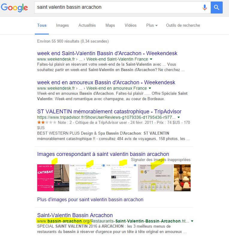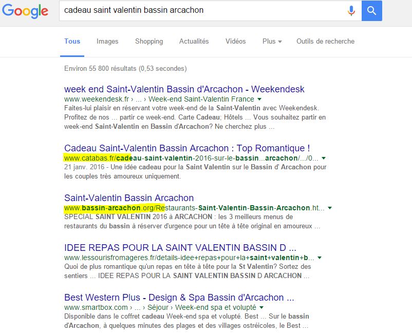 Pour preuve, inspectons le premier moteur de recherche de France sur les requêtes les plus tapées sur la Saint-Valentin et concentrons nous sur le top 5 de la première page (+80 % des recherches cliquées)